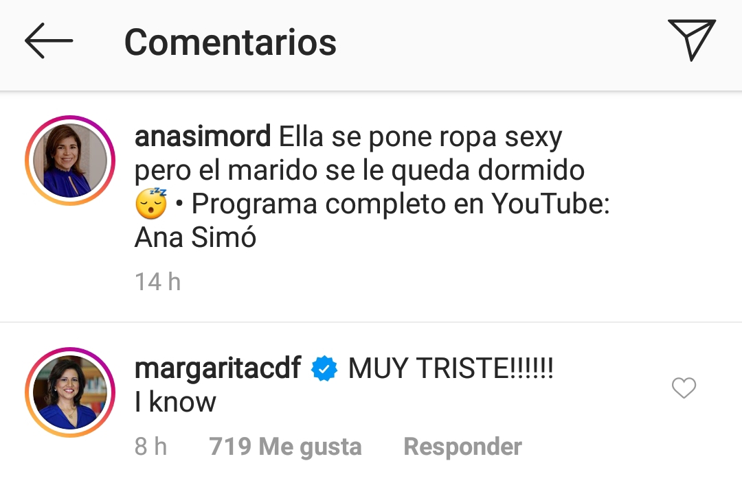 La doctora Ana Simó publicó en su cuenta de Instagram, un caso titulado “Ella se pone ropa sexy pero el marido se le queda dormido” , tema al que reaccionó la actual vicepresidenta de la República y esposa del expresidente Leonel Fernández, Margarita Cedeño.