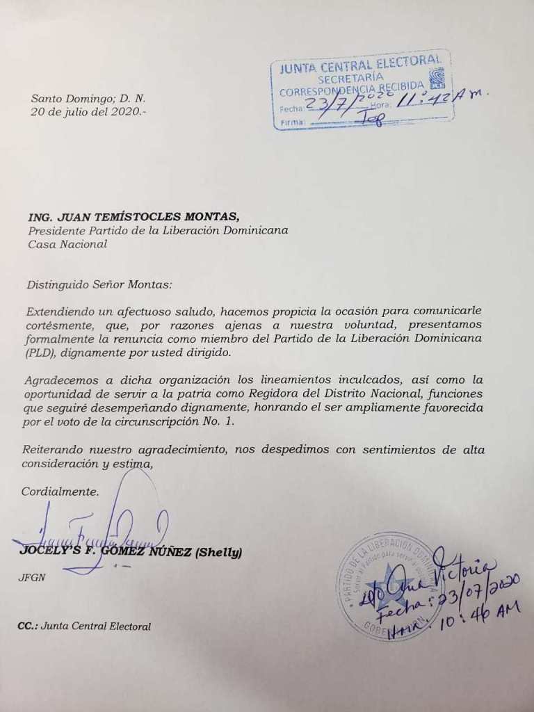 La regidora de la Circunscripción número 1 del Distrito Nacional, Shelly Gómez, presentó su renunció del Partido de la Liberación Dominicana (PLD), en el día de hoy aclaró que no renunciará del cargo que ocupa actualmente.